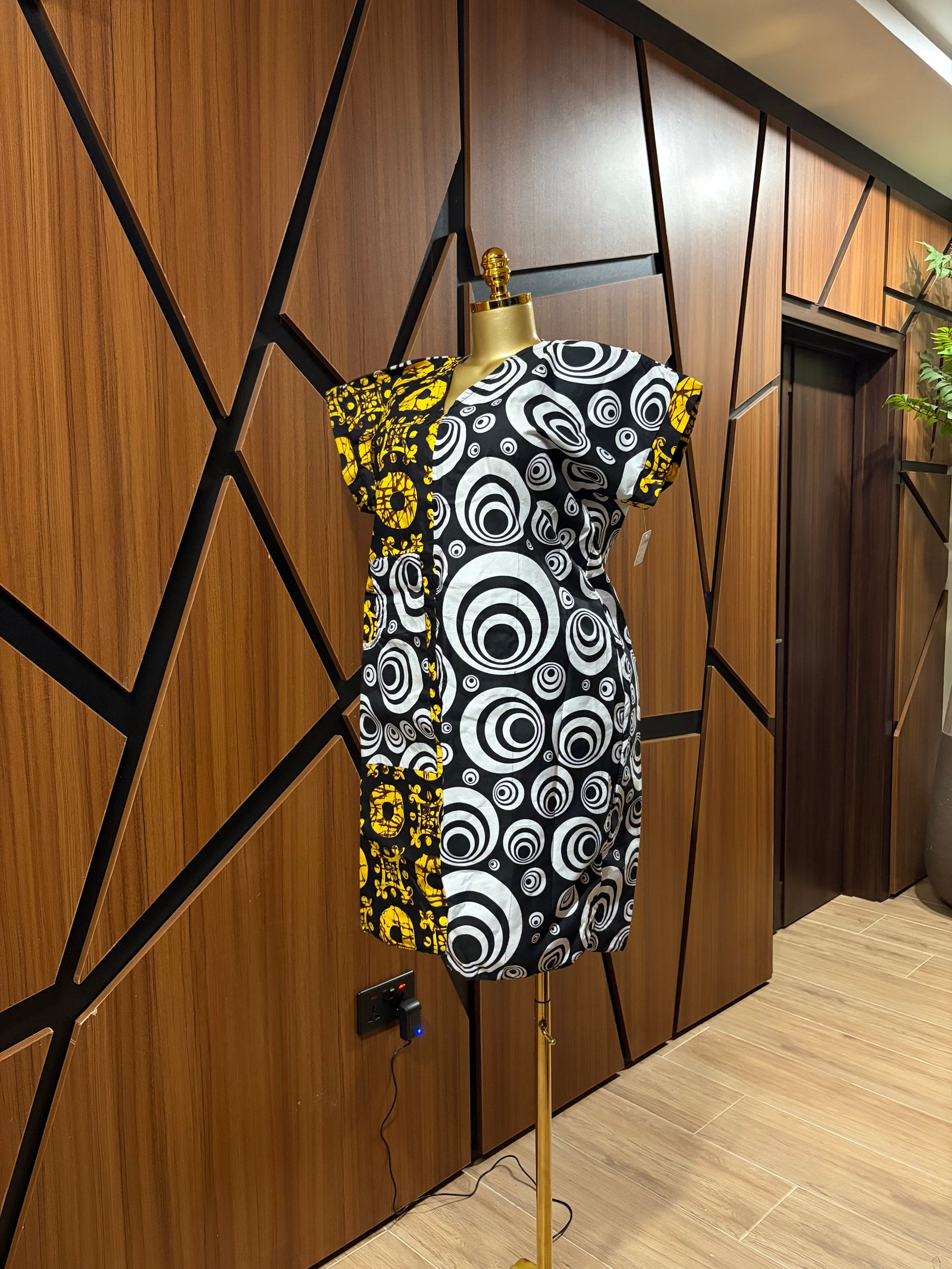 Knee length African print dress. Made with two different fabric design to give it a creative touch.